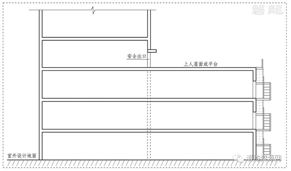 1.3 上人屋面或平臺通過滿足疏散要求的階梯等直達地面,階梯不受建筑外墻的燃燒性能和耐火極限以及建筑門窗洞口影響。(圖示5)