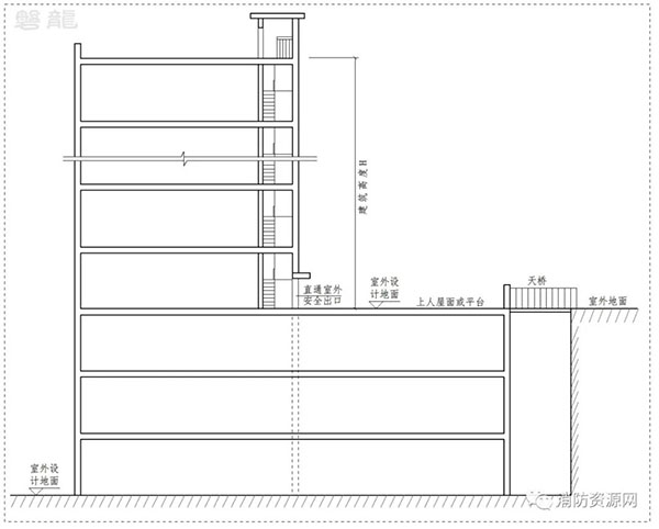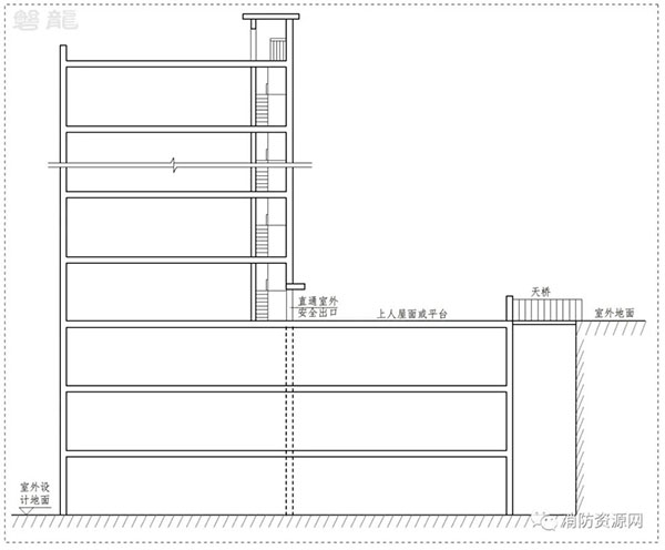 1.1 上人屋面或平臺與地面直接連通,或通過天橋直達地面(圖示3):