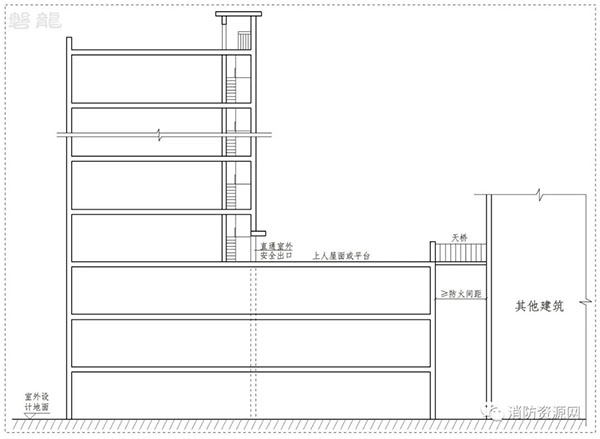 1.2 上人屋面或平臺通過滿足規(guī)范要求的天橋、連廊直達其他建筑(圖示4):