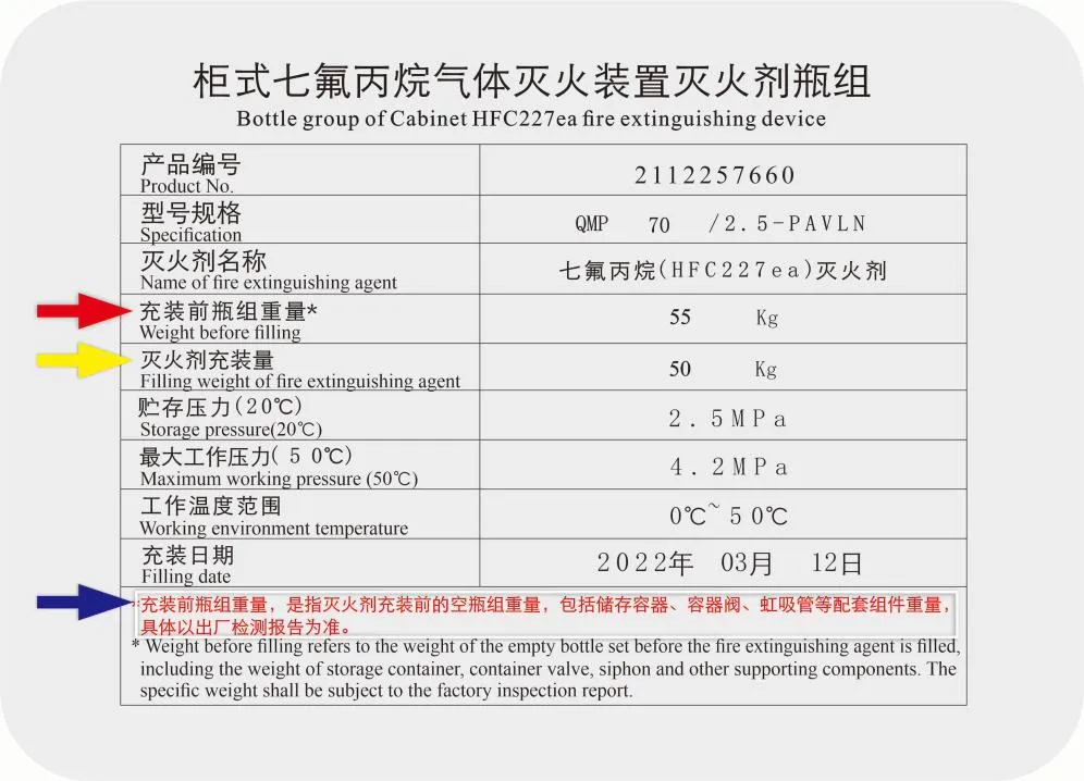 科學(xué)合理的標(biāo)識應(yīng)如《氣體滅火系統(tǒng)及部件》GB 25972-2024所明確:在瓶組明顯部位永久性標(biāo)識“瓶組充裝前質(zhì)量”、“介質(zhì)充裝量”和“瓶組充裝后質(zhì)量”。