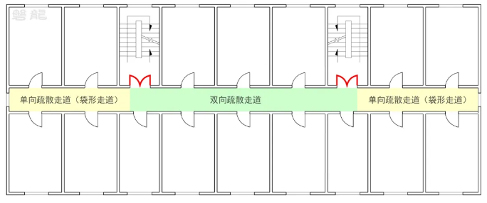 根據(jù)安全出口的數(shù)量及房間疏散門的相對(duì)位置,疏散走道的疏散形式可分為雙向疏散走道和單向疏散走道。