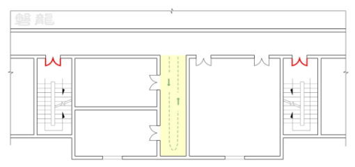 示例:【圖示7】所示疏散走道中,所有房間的疏散門均具備兩個(gè)疏散方向,房間疏散門至安全出口的距離可按雙向疏散走道標(biāo)準(zhǔn)確定。