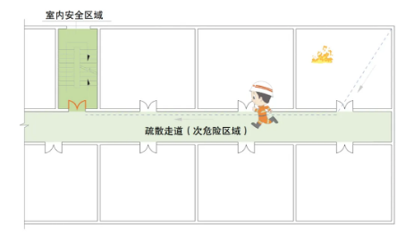 室內(nèi)房間屬于危險區(qū)域,一旦發(fā)生火災(zāi),人員應(yīng)迅速疏散至相對安全的次危險區(qū)域(疏散走道),通過疏散走道疏散至安全出口【圖示1】。