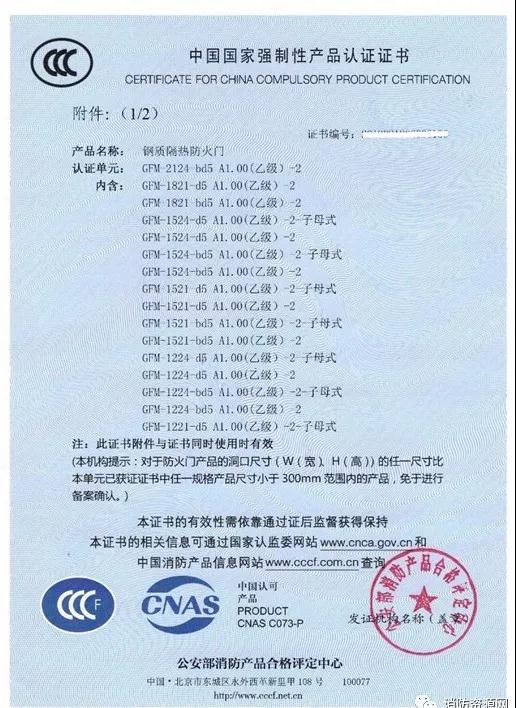 附2:子母式防火門的產(chǎn)品認證證書樣式(注:現(xiàn)已轉(zhuǎn)為自愿性認證):