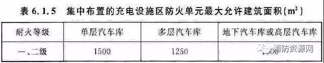 根據(jù)《電動(dòng)汽車分散充電設(shè)施工程技術(shù)標(biāo)準(zhǔn)》(GB/T51313-2018)要求,新建汽車庫內(nèi)配建的分散充電設(shè)施在同一防火分區(qū)內(nèi)應(yīng)集中布置,應(yīng)設(shè)置獨(dú)立的防火單元,每個(gè)防火單元的最大允許建筑面積應(yīng)符合表6.1.5的規(guī)定。
