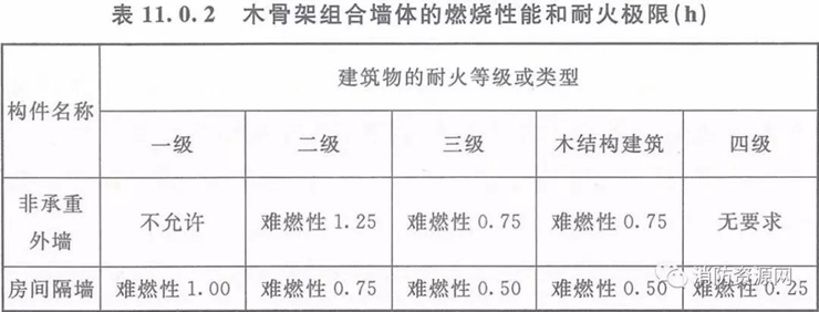 3、木骨架組合墻體的燃燒性能和耐火極限應符合表11.0.2的規(guī)定,其他要求應符合現(xiàn)行國家標準《木骨架組合墻體技術規(guī)范》GB/T 50361的規(guī)定。
