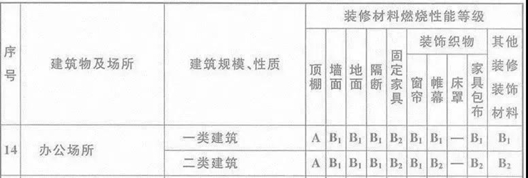 二、辦公建筑內(nèi)部各部位裝修材料的燃燒性能等級,不應低于下列規(guī)定: