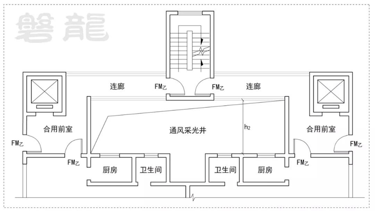 圖1所示的方案,連廊僅作為疏散走道,屬于次危險區(qū)域,規(guī)范對于疏散走道并無明確要求,但亦應(yīng)考慮一定的安全間距,h1≥2m應(yīng)可滿足要求。 二、當(dāng)連廊作為前室或前室連通區(qū)域時,應(yīng)視為相對安全區(qū)域,須考慮合理的安全間距。 圖2的連廊作為前室,圖3的連廊作為前室通往樓梯間的一部分,這兩種圖示的連廊,風(fēng)險等級和前室相當(dāng),應(yīng)視為相對安全區(qū)域,須考慮合理的安全間距,可參照規(guī)范圖示“回字形”建筑平面示例,h2≥6m(有爭議)。
