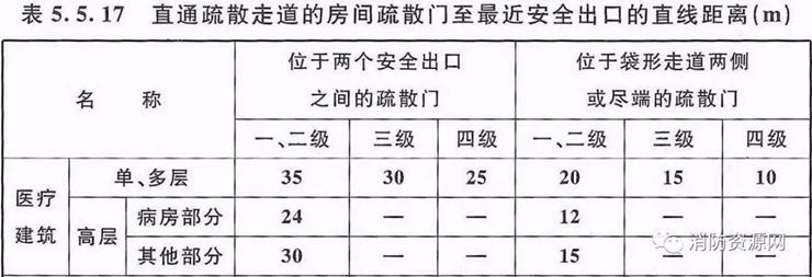 2、醫(yī)療建筑直通疏散走道的房間疏散門至最近安全出口的直線距離,不應(yīng)大于《建規(guī)》5.5.17的規(guī)定。