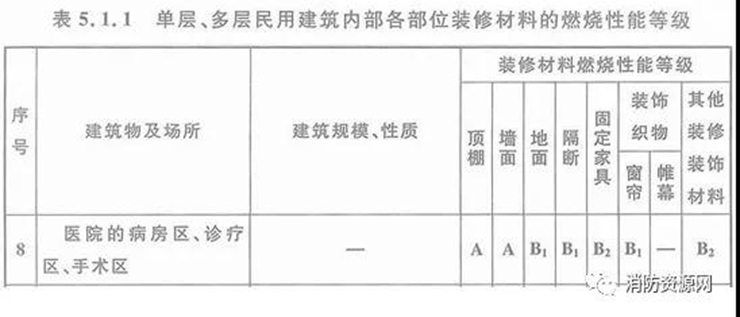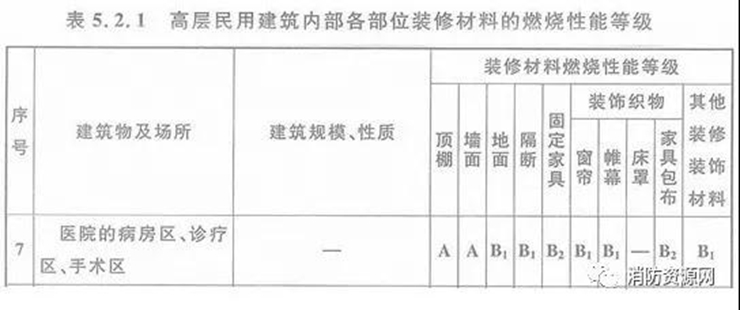 二、高層醫(yī)院建筑的病房區(qū)、診療區(qū)、手術(shù)區(qū),內(nèi)部各部位裝修材料的燃燒性能等級,不應(yīng)低于《建筑內(nèi)部裝修設(shè)計(jì)防火規(guī)范》表5.2.1的規(guī)定。