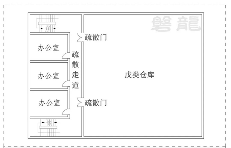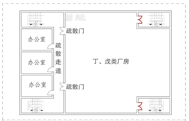 雖然規(guī)范未要求丁戊類廠房和戊類倉庫的辦公休息室采用防火隔墻分隔,但考慮辦公休息室的不同建筑類別,以及生產(chǎn)儲存區(qū)域的實際風(fēng)險,因此仍有必要作為相對獨立的區(qū)域,可采用普通隔墻(房間隔墻或疏散走道隔墻)與生產(chǎn)儲存區(qū)域分隔。