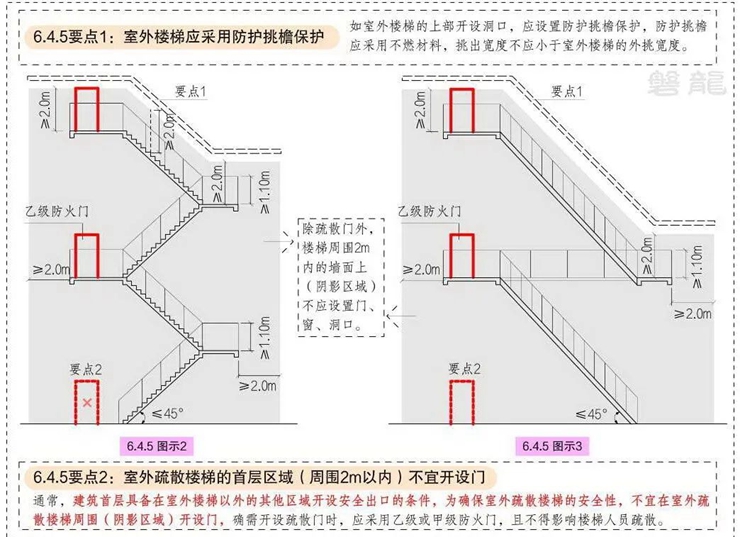 《<建筑設計防火規(guī)范>圖示及應用》第6.4.5條示意了室外疏散樓梯的防護挑檐做法,附文末。